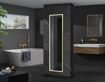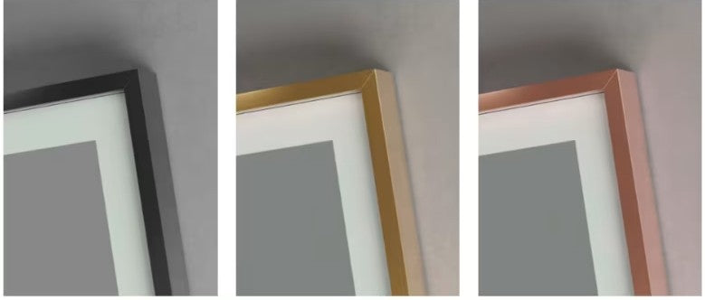 Son cadre en aluminium, disponible en Noir Mat, Or Brossé ou Or Rose, apporte une touche contemporaine et raffinée. Son verre sablé de 5 mm diffuse une lumière homogène sans ombre, idéale pour le maquillage et le rasage.