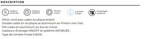 Le miroir LED Bolonia Ledimex combine design moderne et technologie avancée. Sa forme ronde et son double cadre en acrylique et aluminium noir mat offrent un style élégant, tandis que son éclairage LED périmétrique froid (6500 K) assure une lumière puissante et homogène.