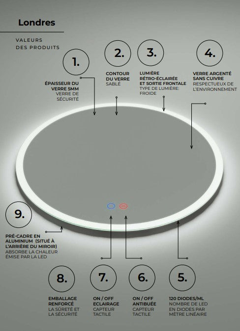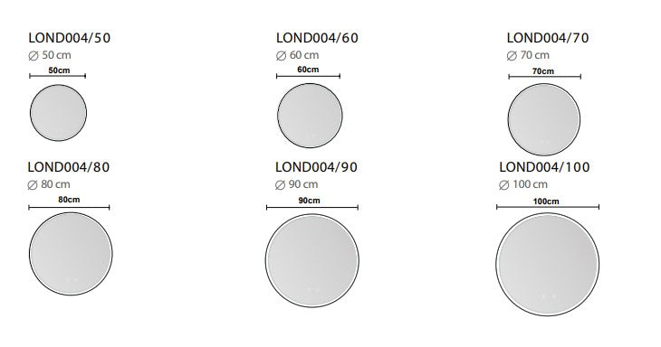 Disponible en 50, 60, 70, 80, 90 et 100 cm, le miroir LED Londres s’adapte à toutes les salles de bains et offre un rendu à la fois tendance et fonctionnel.